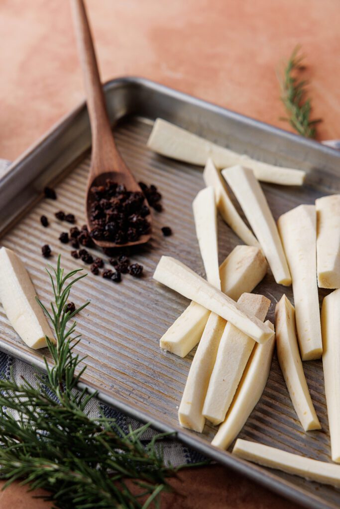 • Heat the oven to 400°F. In a large bowl, toss the parsnips with the garlic, ginger, Rosemary Sea Salt and Rosemary Olive Oil. Be sure the parsnips are well coated with oil. Divide between two sheet pans.